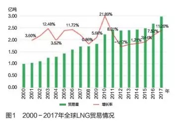 2017年,全球液化天然氣(LNG)貿(mào)易量再創(chuàng)歷史新高,達到2.97億噸(約3900億立方米),比上年增長了2989萬噸。全球LNG貿(mào)易量增速延續(xù)了近5年的良好勢頭,增長率在2017年重回兩位數(shù),達到了11.20%,這是2011年以來全球LNG貿(mào)易量的高增速(見圖1)。