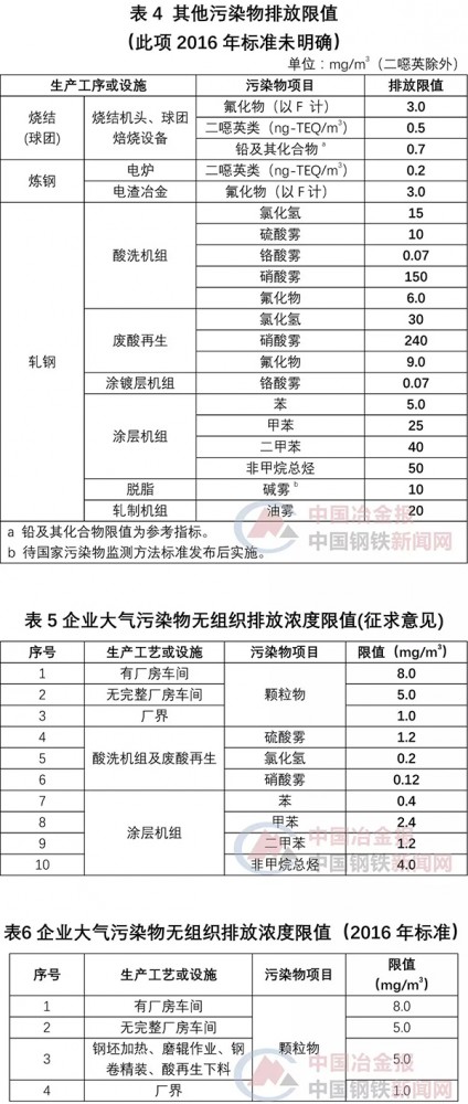 下列表格中“征求意見”是指河北省2018年4月份發(fā)布的《鋼鐵工業(yè)大氣污染物超低排放標(biāo)準(zhǔn)》(征求意見稿)內(nèi)容,“2016年”標(biāo)準(zhǔn),是指《河北省環(huán)境保護(hù)廳關(guān)于河北省鋼鐵行業(yè)執(zhí)行大氣污染物特別排放限值的公告》(2016年 第1號)中規(guī)定的排放限值。